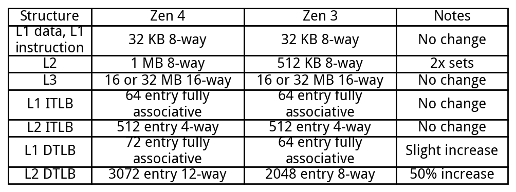 While the L1D size and associativity has not changed, its natural alignment has changed to 64 bytes instead of 32 bytes on previous Zen generations. This doesn’t guarantee 64 byte (512-bit) per cycle ports to the data cache – Zen 1’s data cache had a natural alignment of 32 bytes but 16 byte per cycle (128-bit) load and store ports. Regardless, Zen 4 should achieve higher load/store throughput than previous generations because memory operations that cross a 32 byte boundary without crossing a 64 byte one won’t incur an extra data cache access.