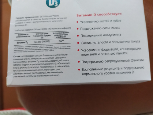 Количество таблеток в упаковке 60 по 2000 МЕ . . . . Unipharm Детримакс 2000 - витамин D3 . Теперь принимаю витамин D3 только в первой половине дня . . . . +10 фото .