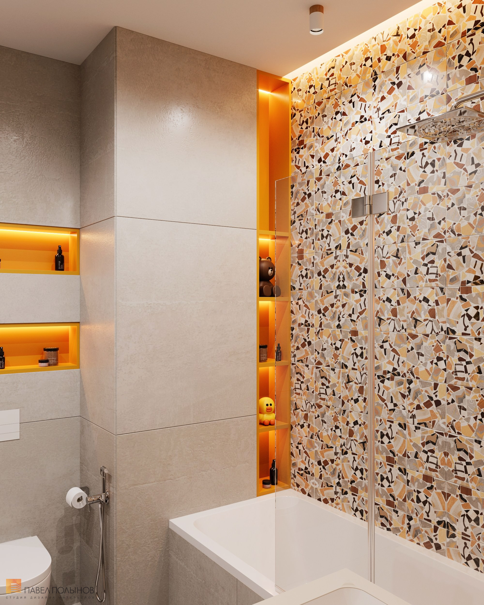 Детские санузлы отличаются жизнерадостностью и смелым дизайном . 1 . Интерьер детской ванной комнаты в оранжевом цвете .