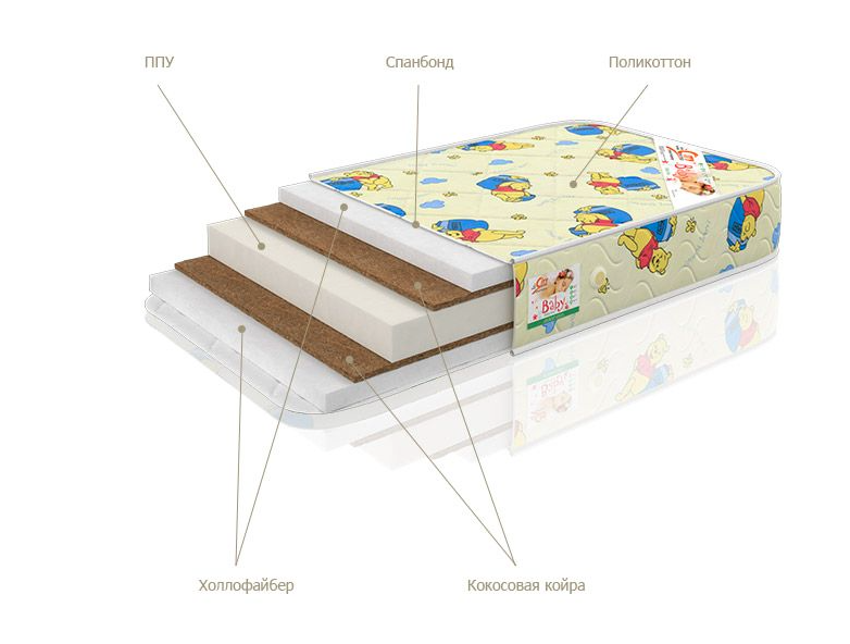 Детский беспружинный матрас из экопены и кокосовой койры. Чехол съемный на молнии. Состав чехла: детский поликоттон.