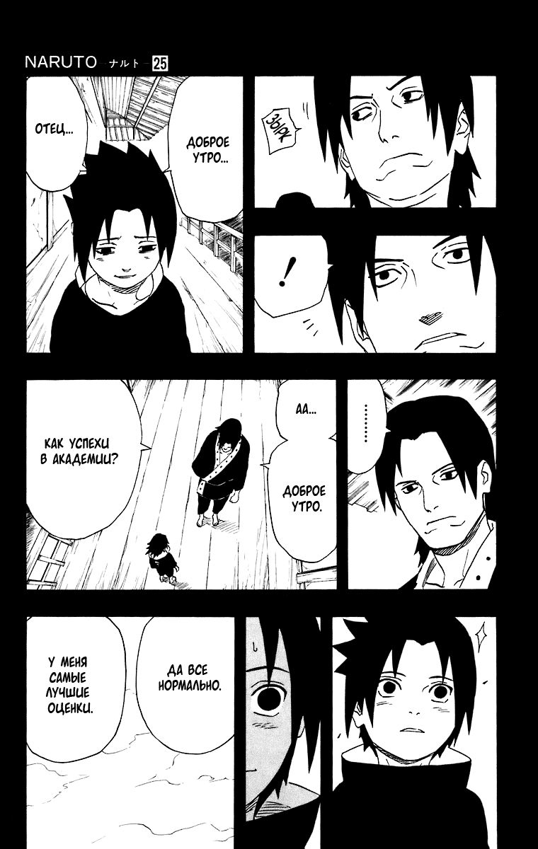 И ведь на самом деле так и есть. Насколько же Саске счастлив, и одновременно удивлён тому, что Фугаку просто поинтересовался про то, как у него дела в академии. То, что должно быть нормой, для Саске всё равно – что подарок судьбы. И Саске не хочет упускать такой редкий и удивительный момент, что сразу начинает с главного. Не как у него настроение, не то, появились ли у него друзья или проблемы, а, прямая цитата – «Да всё нормально. У меня самые лучшие оценки».