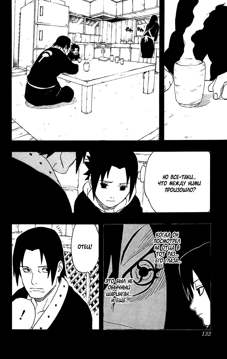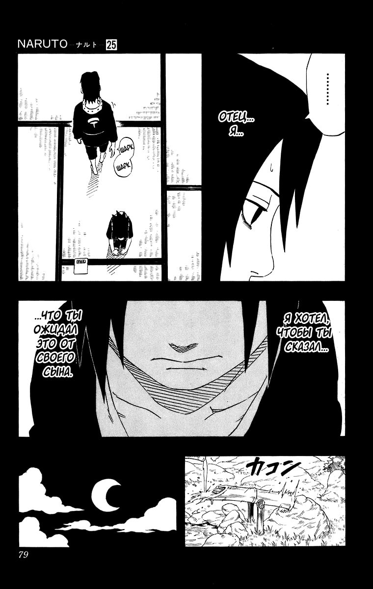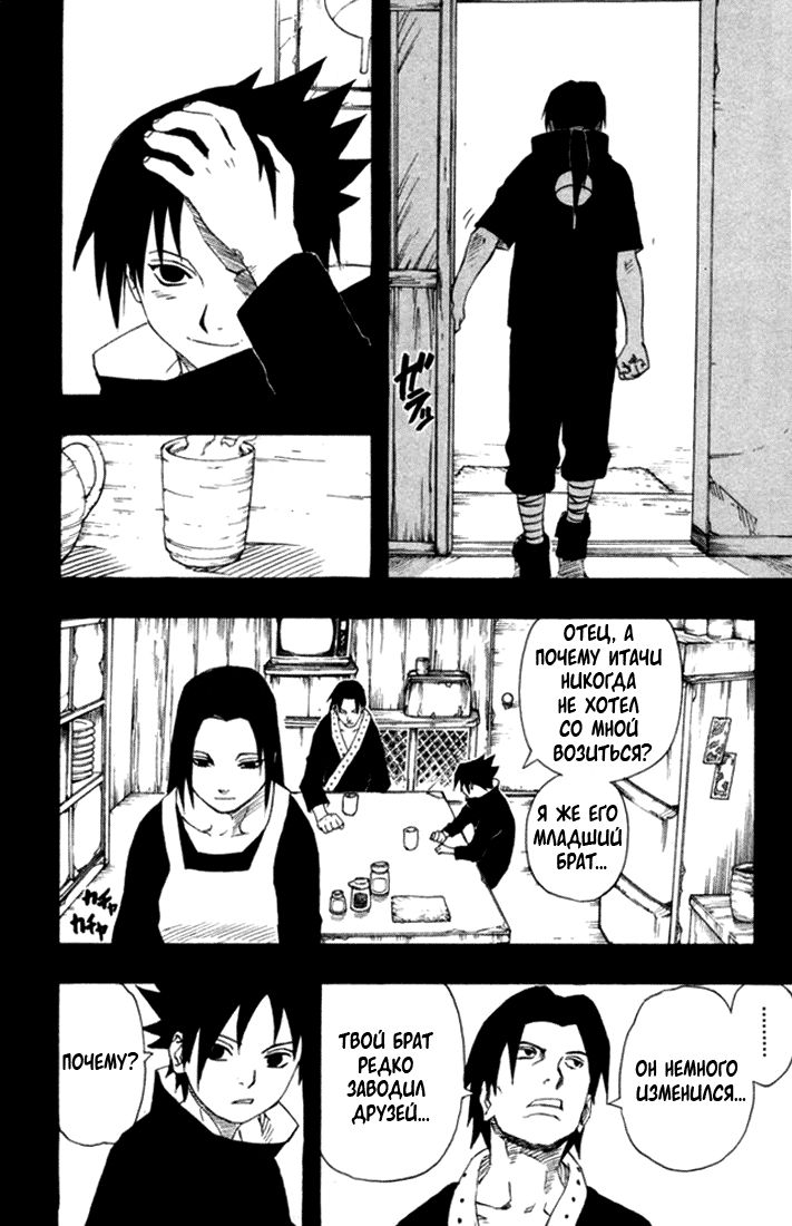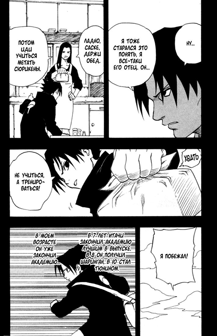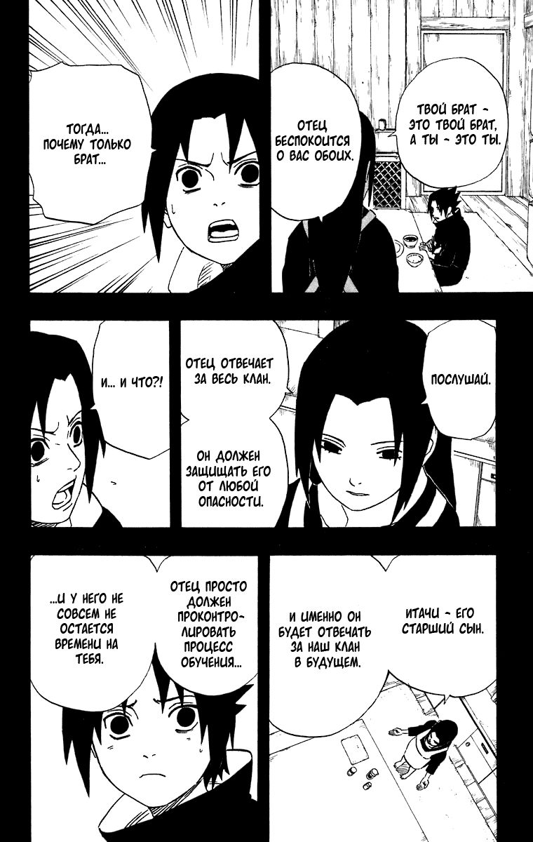 Прямая цитата Саске – «В тот раз Отец... Сказал мне: "этого следовало ожидать от моего сына." И я так обрадовался, когда он вдруг сказал это мне. Он всегда говорил это Итачи... Но... теперь они с Отцом все время ссорятся... Я... Только заменяю брата.»