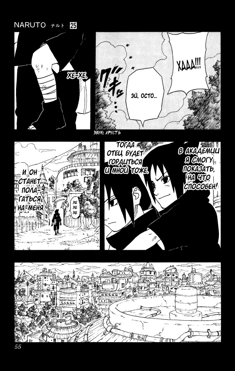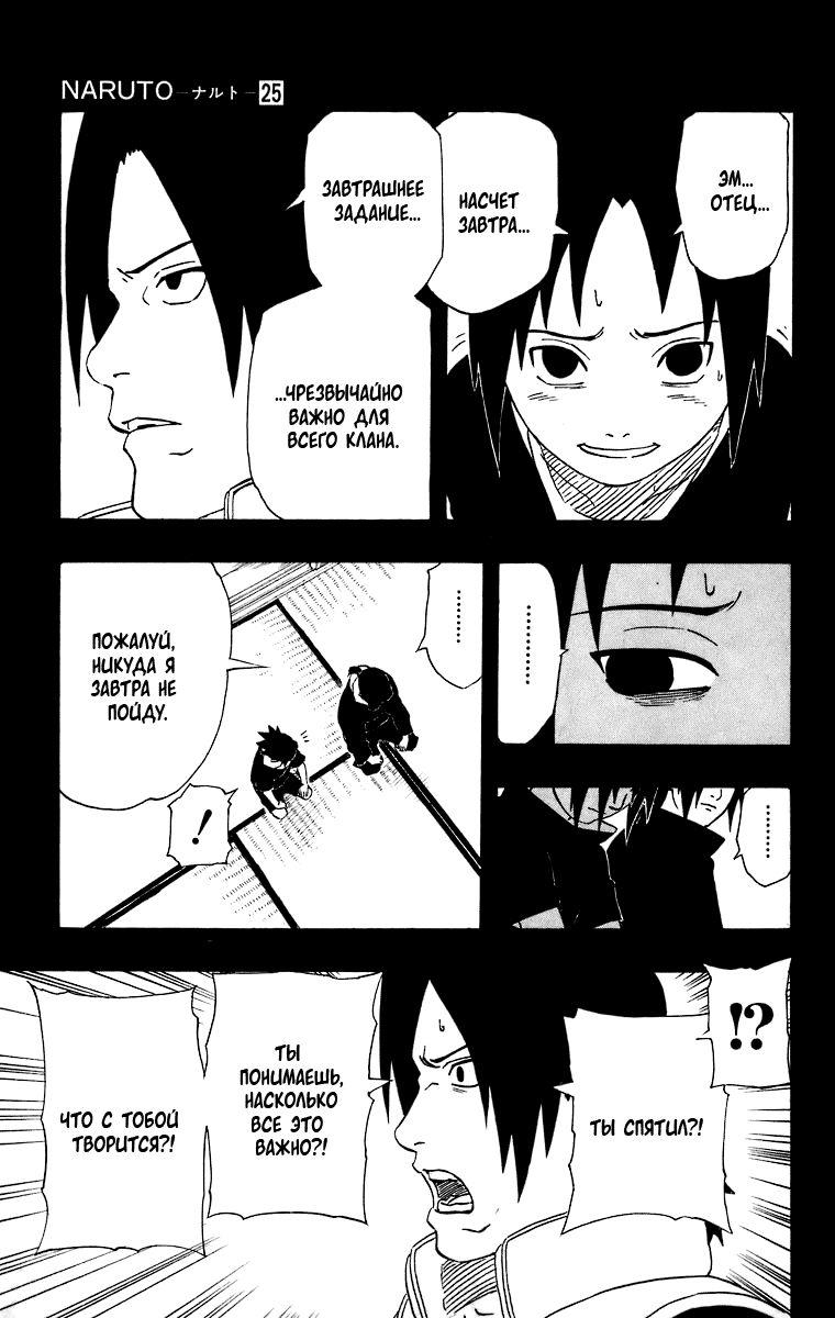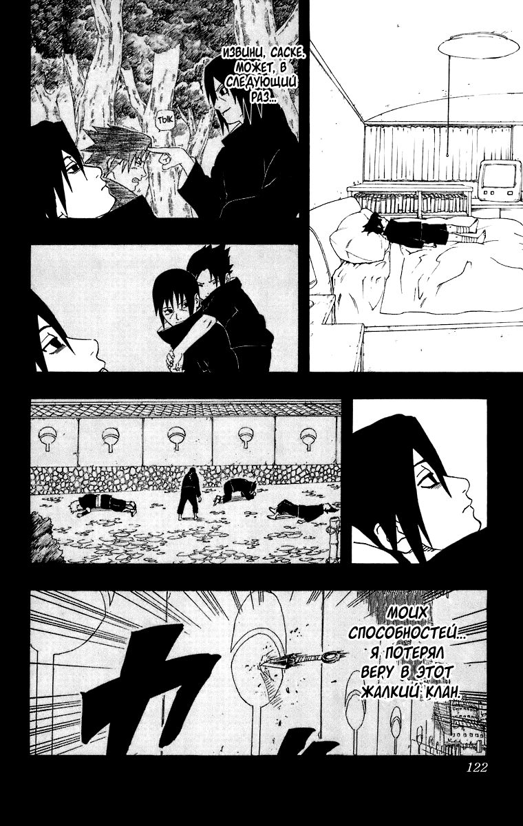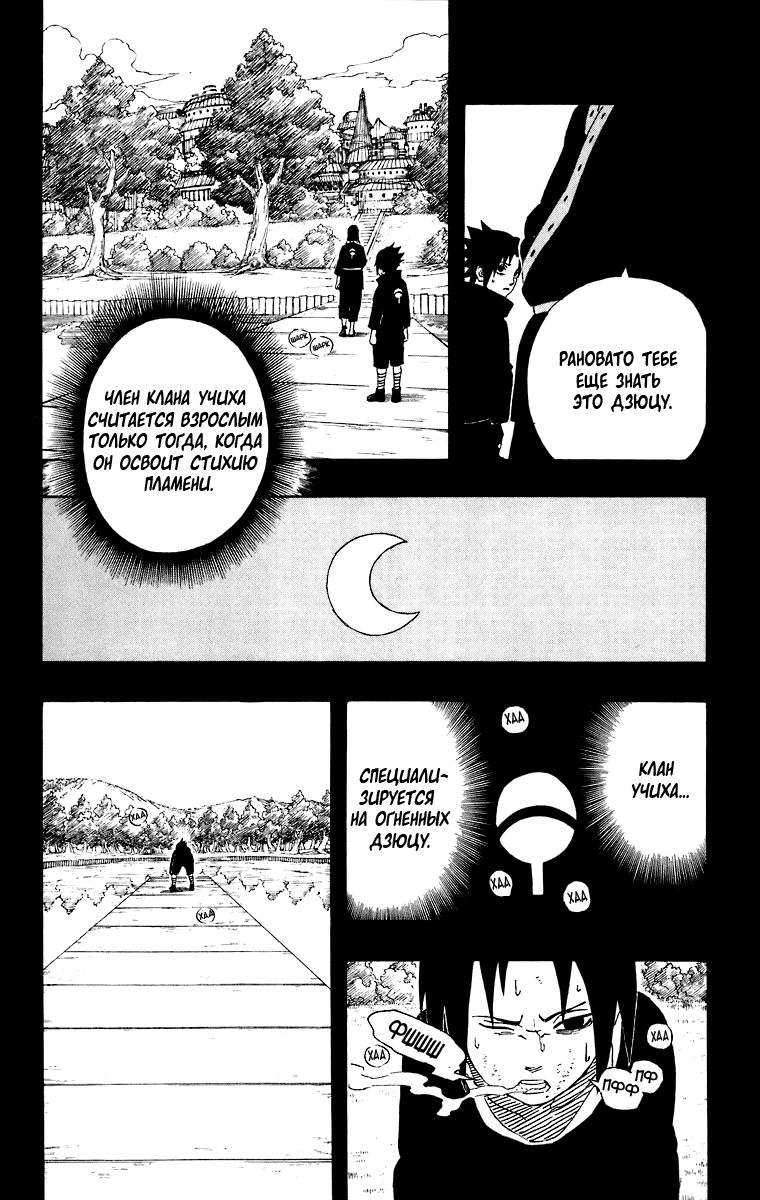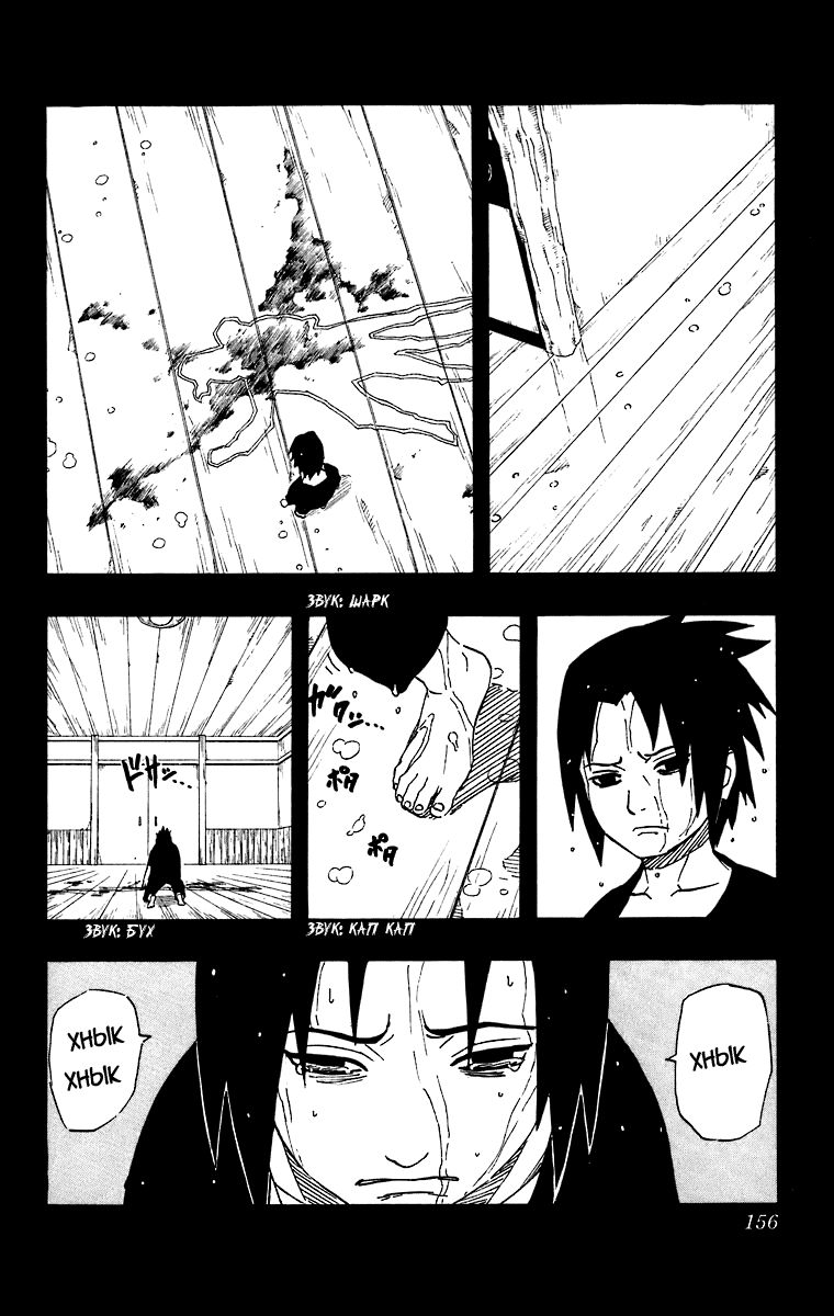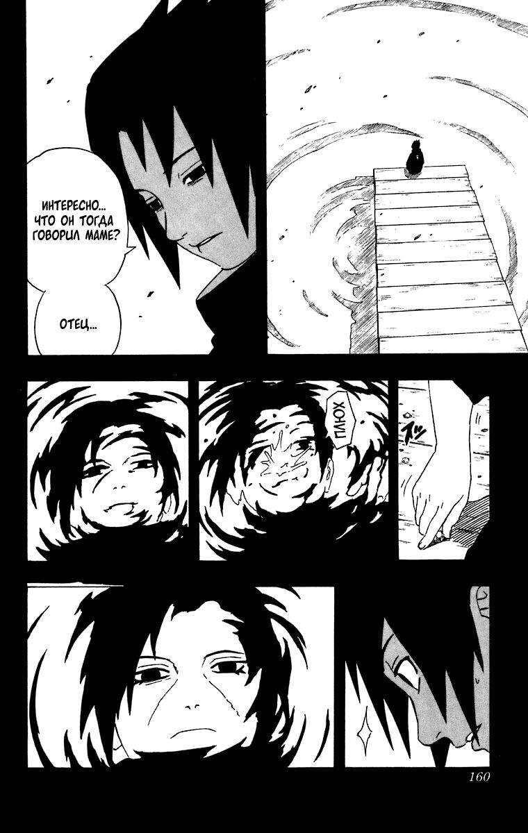 «Я не могу допустить ошибку!» – говорит нам Саске, что нас наталкивает на мысль, что если он ошибётся, то больше попытки не будет. Да и учитывая, как Отцу на него всё равно, то так и есть. Саске осознаёт, что у него только одна попытка.