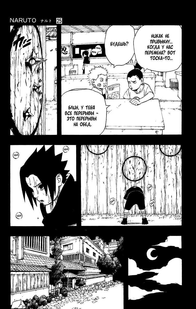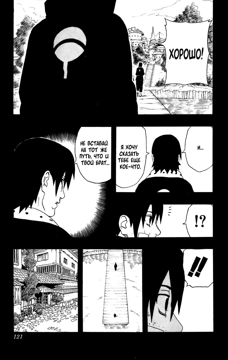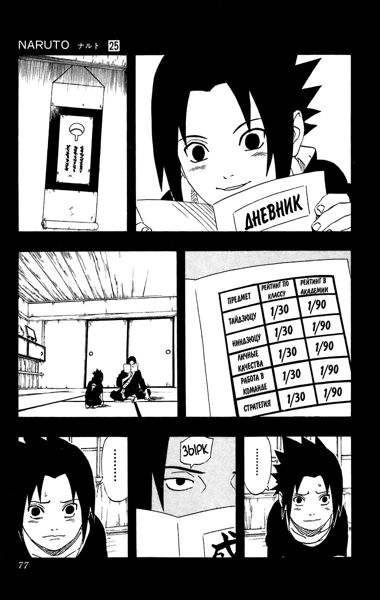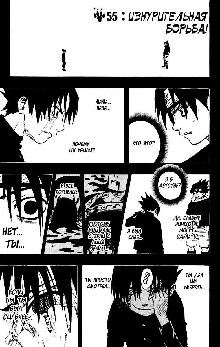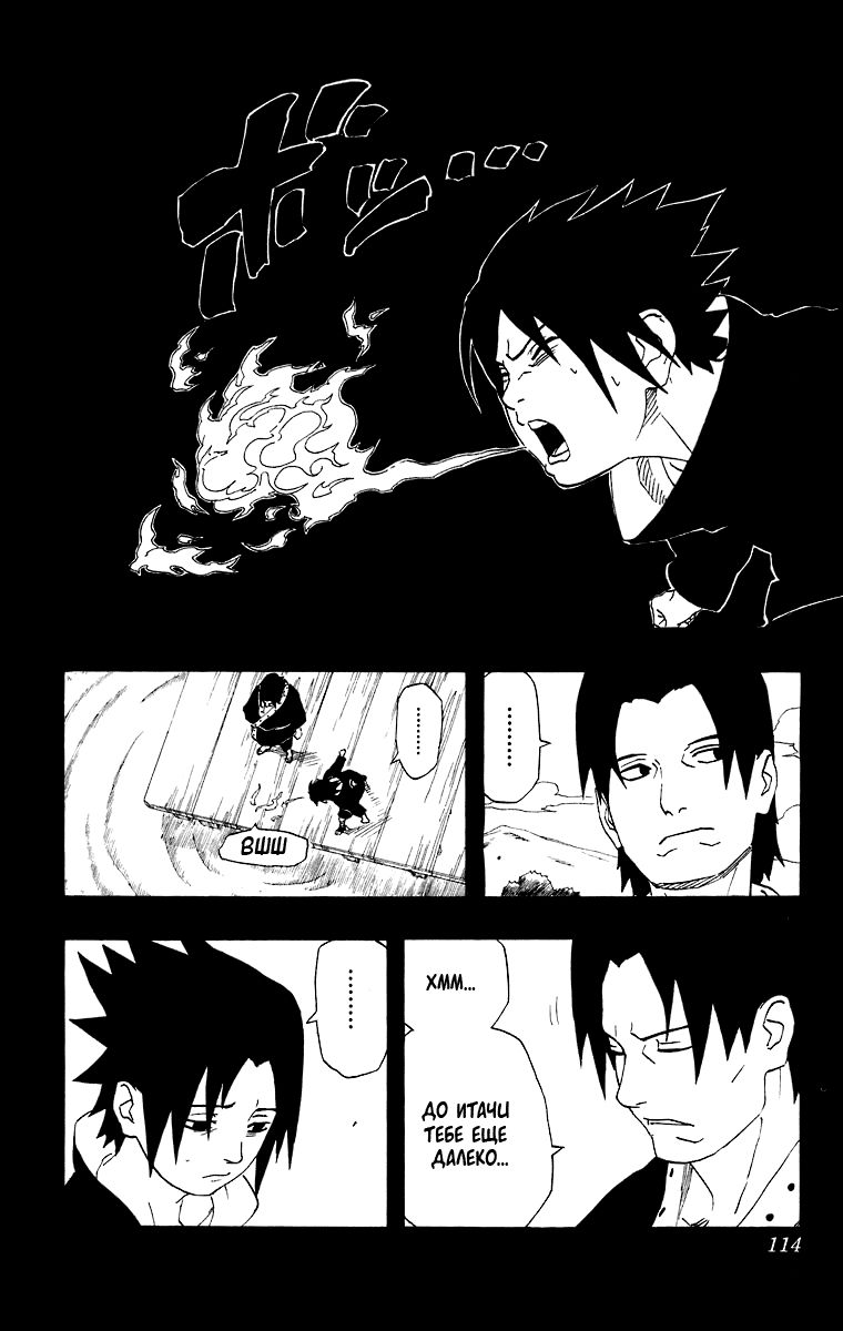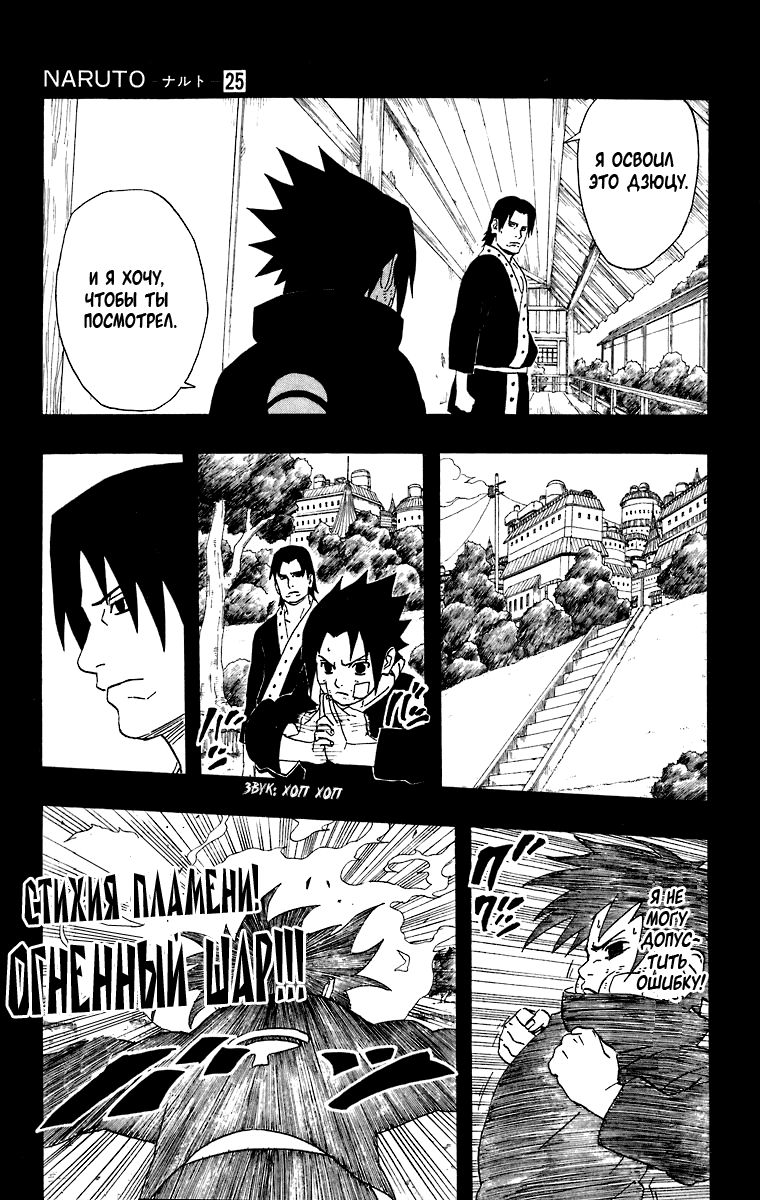 «Я не могу допустить ошибку!» – говорит нам Саске, что нас наталкивает на мысль, что если он ошибётся, то больше попытки не будет. Да и учитывая, как Отцу на него всё равно, то так и есть. Саске осознаёт, что у него только одна попытка.