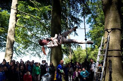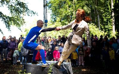 Exhib en publique près d'une grande statue