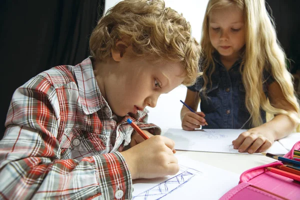 Милая девочка и мальчик в школьной форме на белом фоне . . .