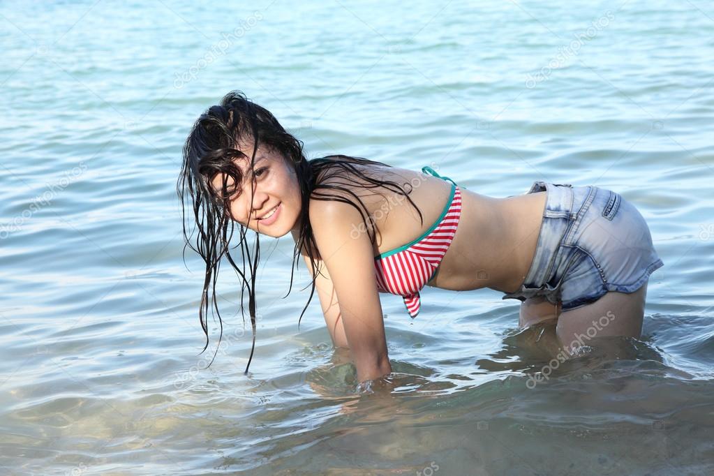 Девка с маленькими сиськами раздевается под водой