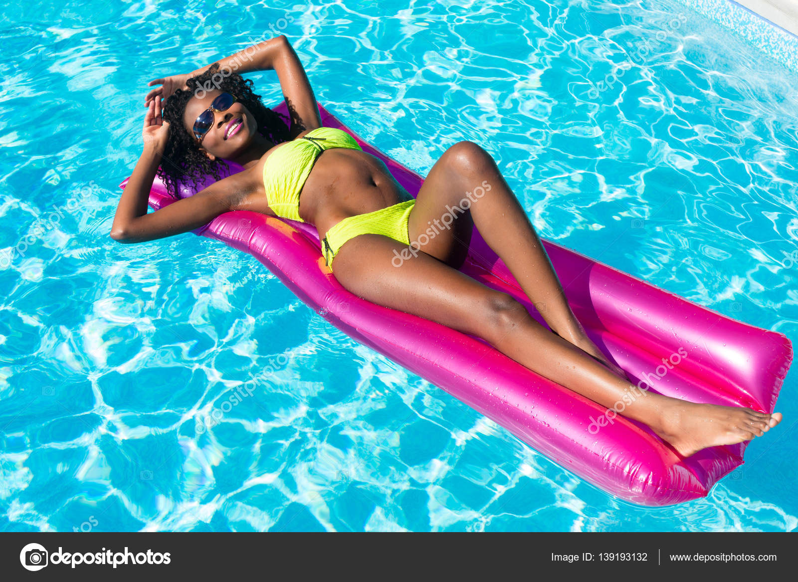 Скачайте стоковую фотографию Красивая девушка загорает на воздушном матрасе в бассейне - 80630222 из многомилионной коллекции лицензионных фотографий, иллюстраций и векторных изображений Depositphotos .