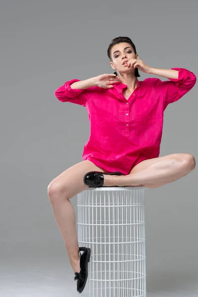 Красивая девушка на стуле с протянутыми руками позирует на розовый, кукла концепции Мужчина и красивая девушка на стуле возле воздушных шаров на сером