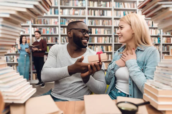The young schoolgirl broadcasts online broadcasting per a webcam in library. Pupils sit at it.
