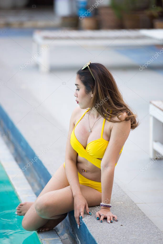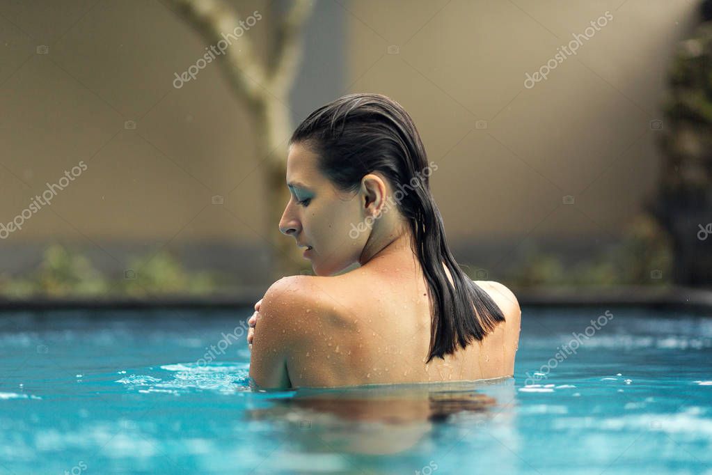 Девушка мокрая около бассейна