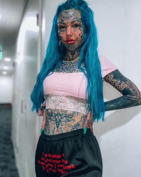 Девушка показывает пирсинг и рисунки на теле