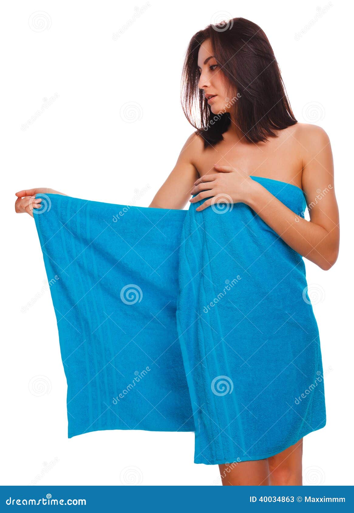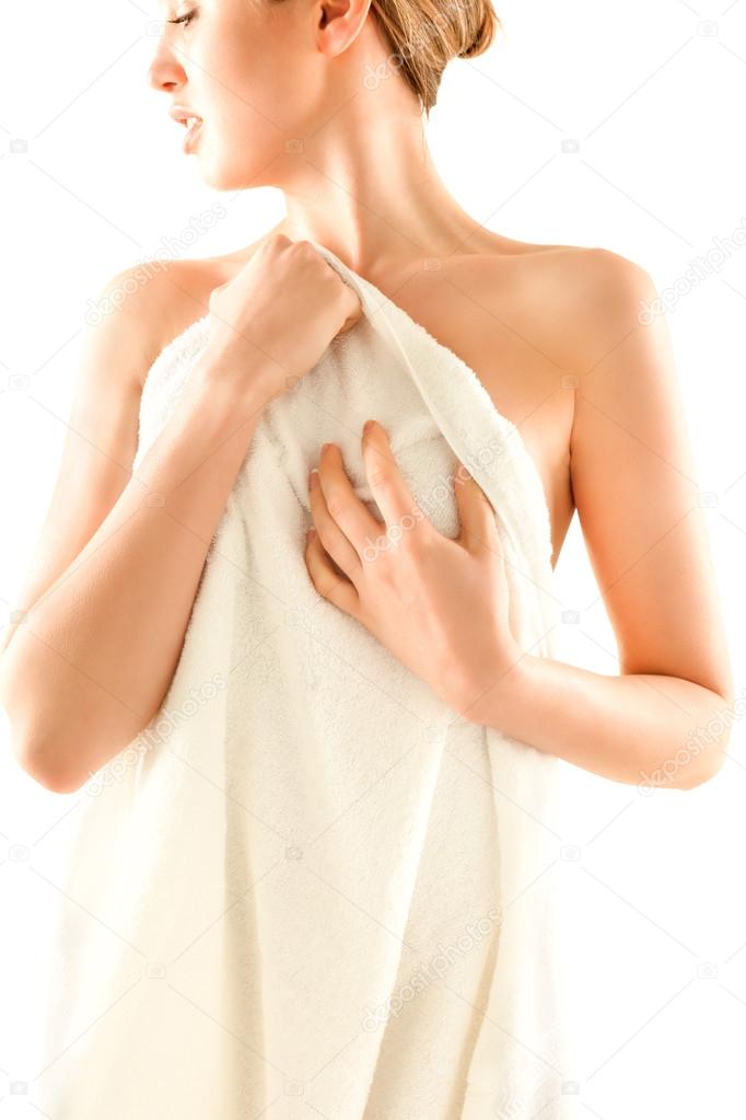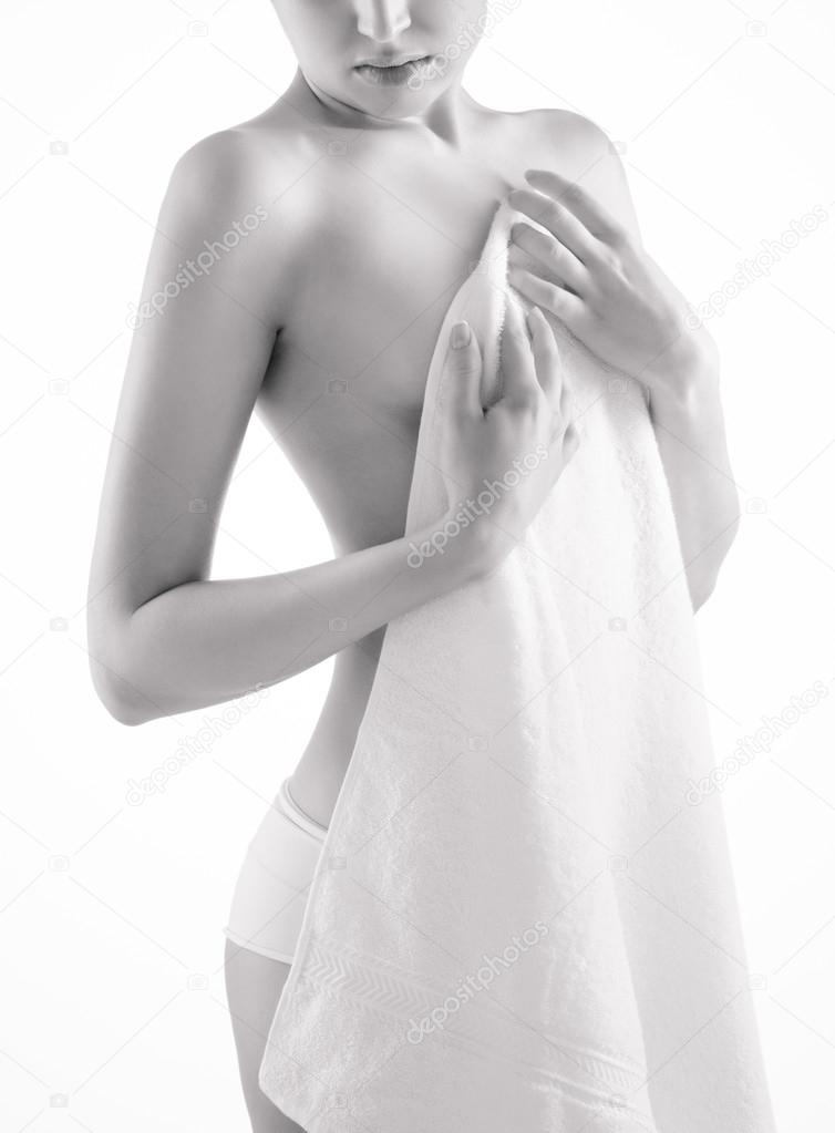 Девушка с полотенцем пытается прикрыть грудь