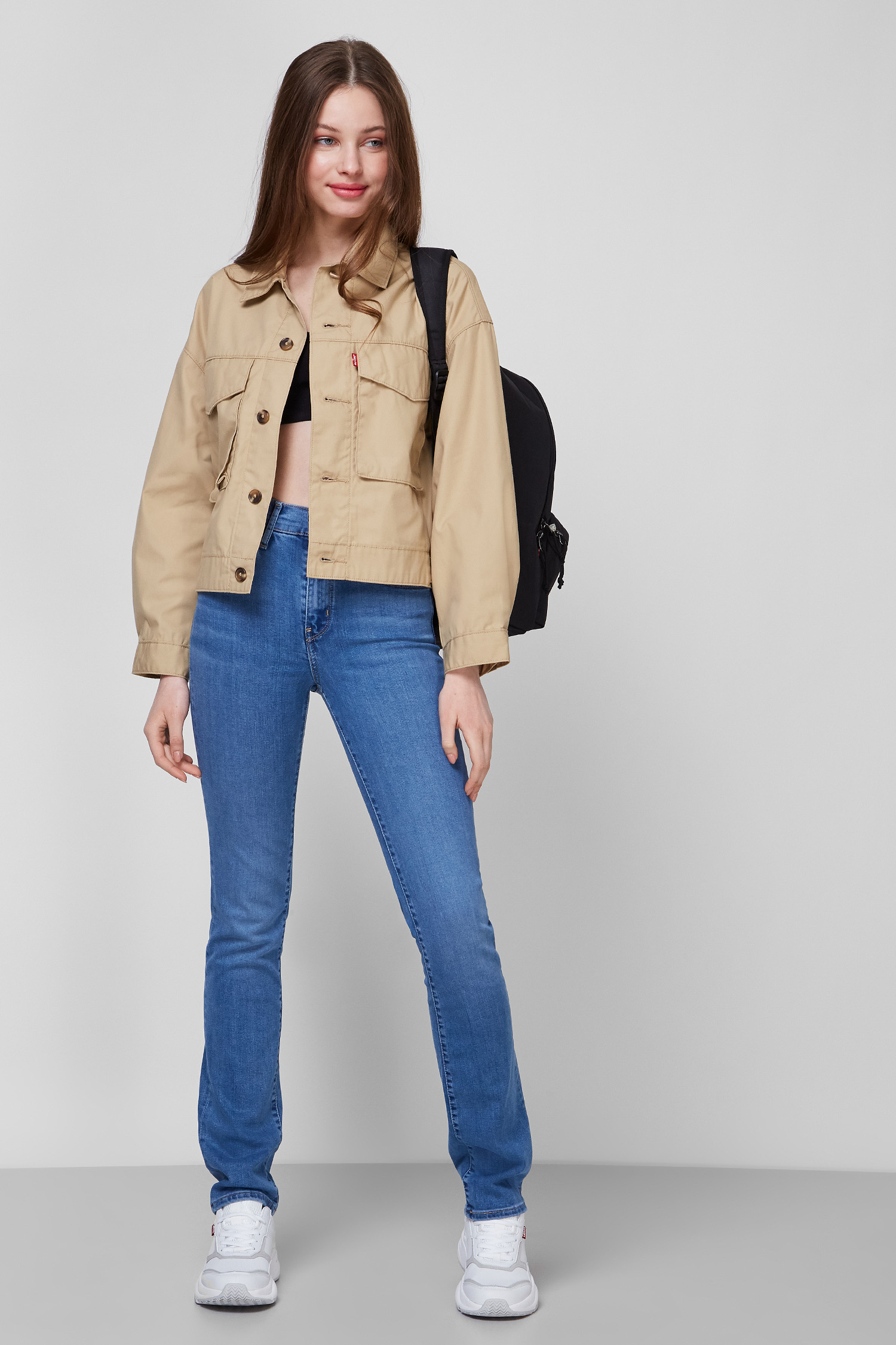 pandorabox Фото красивой девушки в стиле моды на сером фоне, . . . Minchanin Молодая девушка в черной длинной куртке и синих джинсах идет от моря через пляж с черными водорослями . Юрмала Латвия
