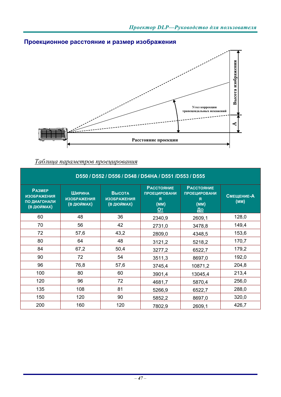 Диагональ проектора от расстояния