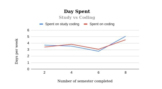 From the questions that students were asked about was, the time they are spending on coding and studying coding. The indicates indicates students spent more days on coding after completing 4 semesters. Relatively spent more days on study coding when they approached the real world industry. The research shows that only 20.8% of students believe they are spending enough time to study coding and 70.0% students did not think they are spending enough time on study coding the rest 9.2% students are not sure weather they are spending enough time or not .