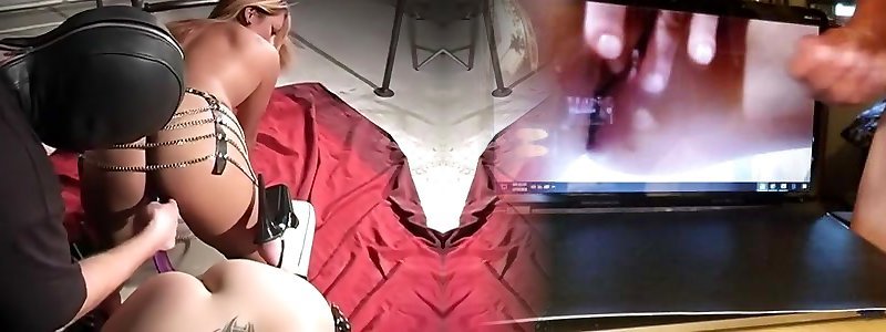 Scharfe Herrin saugt an einem Fake-Schwanz