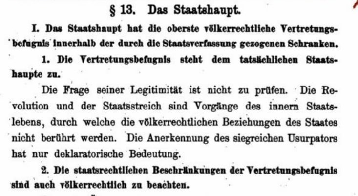 "Die Befugnis zur Ausübung der Staatsgewalt ist nicht durch den rechtmäßigen Erwerb, sondern nur durch den tatsächlichen Besitz derselben bedingt. Die Staatsgewalt kann in keinem Momente eines Repräsentanten entbehren.