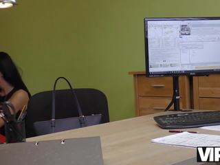 Sexy Brünette in schwarzen Strümpfen besucht ihren Chef