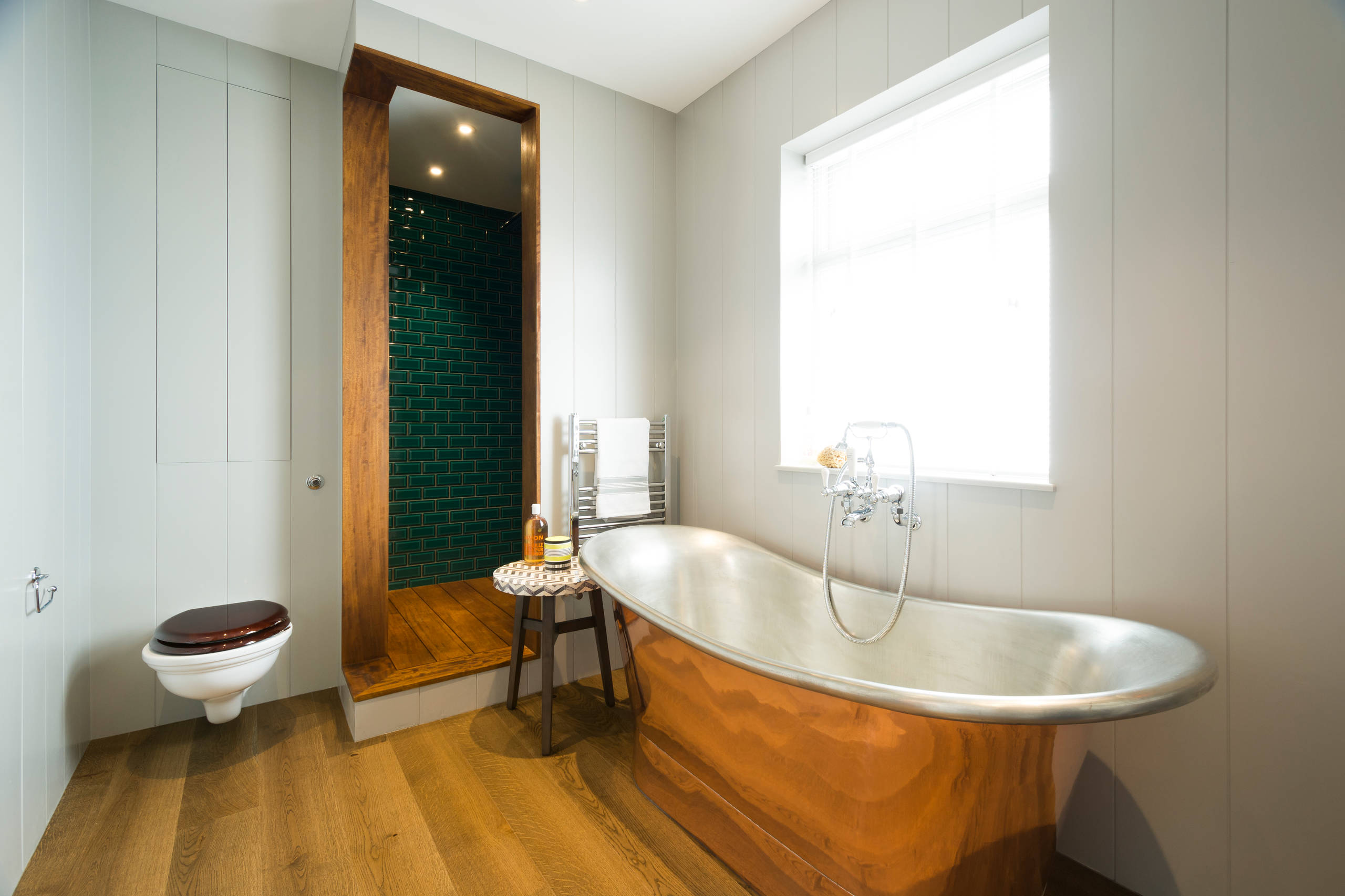 Brushed nickel shower head with digital shower valve, victoria and albert bathtub, curbless shower with hidden shower drain, flat pebble shower floor, shelf over tub with LED lighting, gray vanity with drawer fronts, white square ceramic sinks, wall mount faucets and lighting under vanity . Hidden Drain shower system .