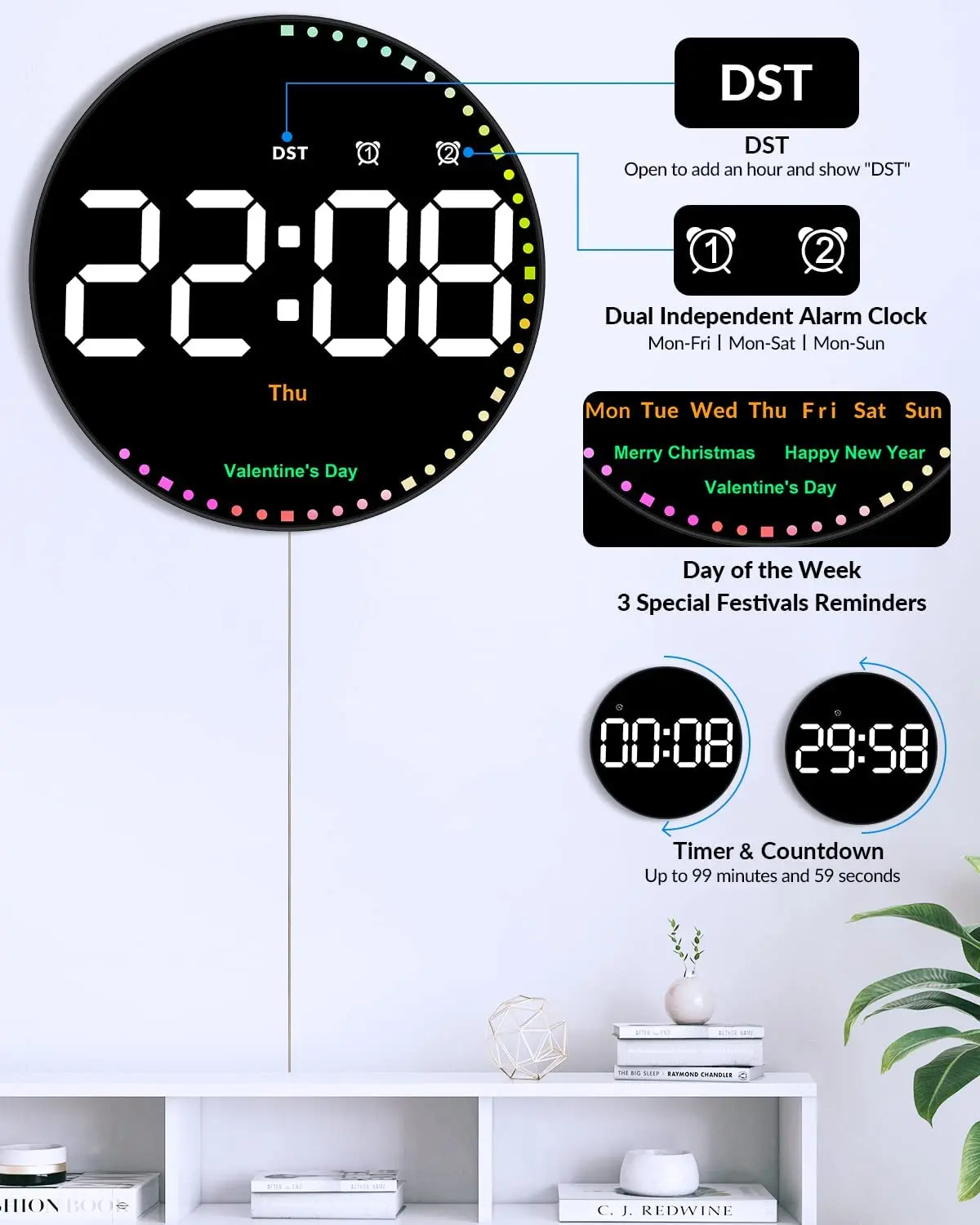 minawJTtAOHere you can buy Digital Electronic Clock Remote Control Temp Date Calendar Round LED Wall Clock for Bedroom Home Decor Smart Dual Alarm Clocks with free delivery to your post office.