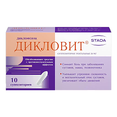 Дикловит (Diclovit) - форма выпуска, состав и упаковка . Суппозитории ректальные белого или белого с кремоватым оттенком цвета, торпедообразной формы . 1 супп . диклофенак натрия 50 мг .