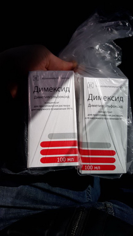 Димексид 100% (99%) концентрации предлагается во флаконах из темного стекла объемом 50 и 100 мл . Стандартное содержание картонной пачки: один флакон с раствором и инструкцией по применению .
