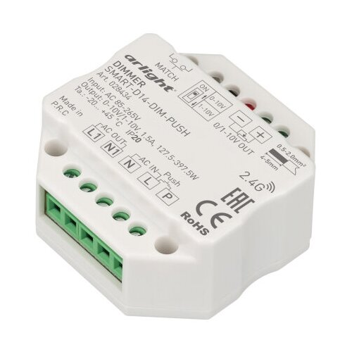 Tek renkli ışık kaynakları için dimmer (çıkış 0/1-10V, röle). Güç kaynağı/çalışma voltajı AC 85-265V, çıkış akımı 1,5A (röle), çıkış gücü (127,5-397,5)W. DIP anahtarı 0-10V/1-10V. Muhafaza - PVC. Boyutları 52x52x26 mm, standart priz kutusuna yerleştirilmiştir. Push-Dim düğmesi ve SMART uzaktan kumandalarla kontrol edilir.