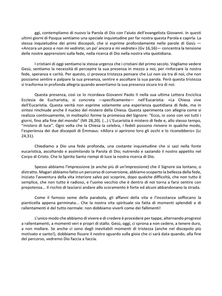 Gesù risponde mostrando loro la strada per sentire Dio vicino, per far capire che Dio stesso che ha fatto tutta la strada per venire da loro dentro la vita . Alla domanda "mostraci il Padre e ci basta!", fatta da uno di loro (ma che interpreta il desiderio di tutti), Gesù risponde ricordando il volto di Dio . Dio ha il volto di Gesù .