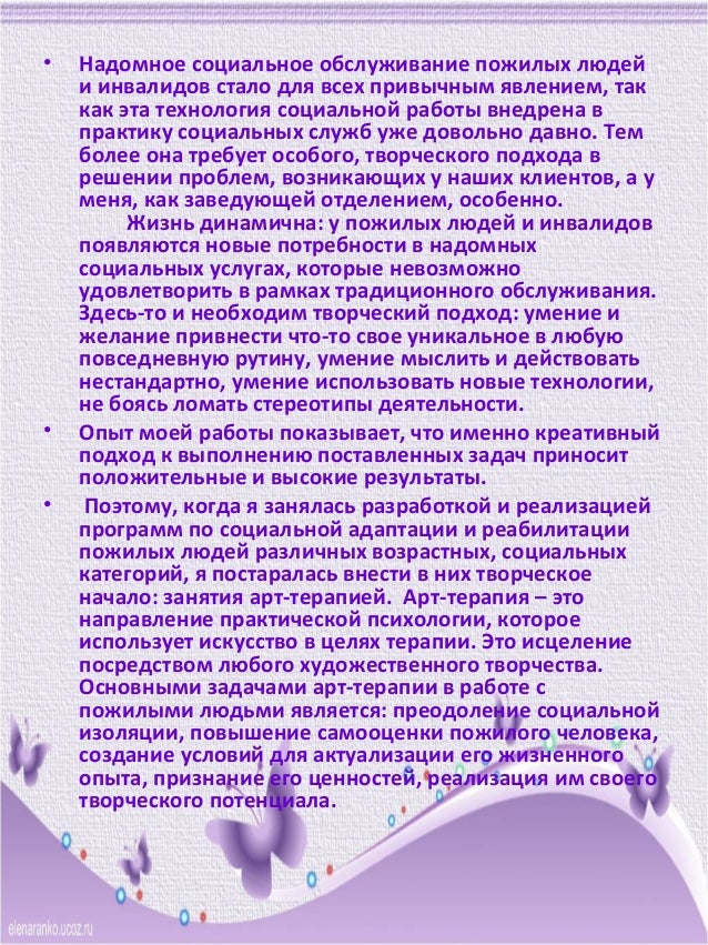 Социальная работа с пожилыми людьми в специальном доме для людей пожилого возраста и инвалидов . Диплом по социологии . 144 Кб / 57 стр / 10609 слов / 74712 букв / 2 сен 2017