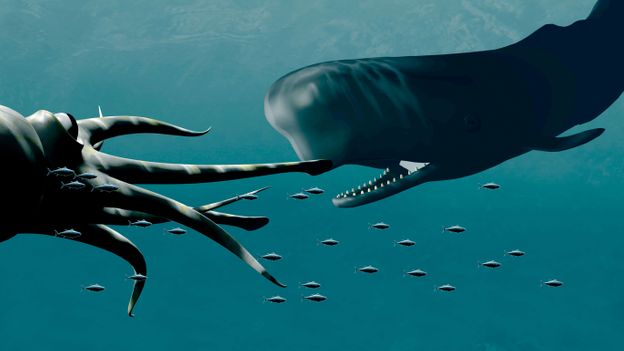 One factor was finding sucker scars, like burn marks all over sperm whales, their main predator . Their beaks have also been found in the whales' stomachs . These were signs of the deep sea battles . . .
