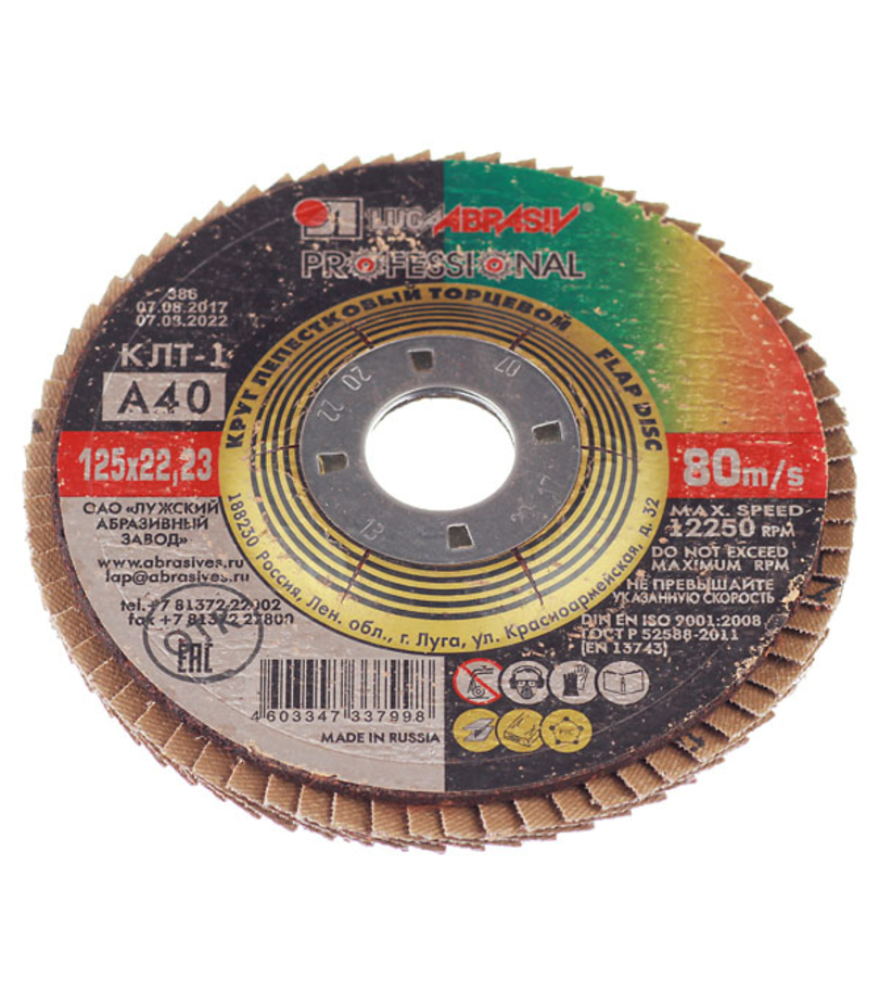 Диск лепестковый шлифовальный торцевой (тип КЛТ1, P40, 125x22 мм) БАЗ 36563-125-40 Упаковкой: 78 р ./шт . Упаковкой выгоднее!