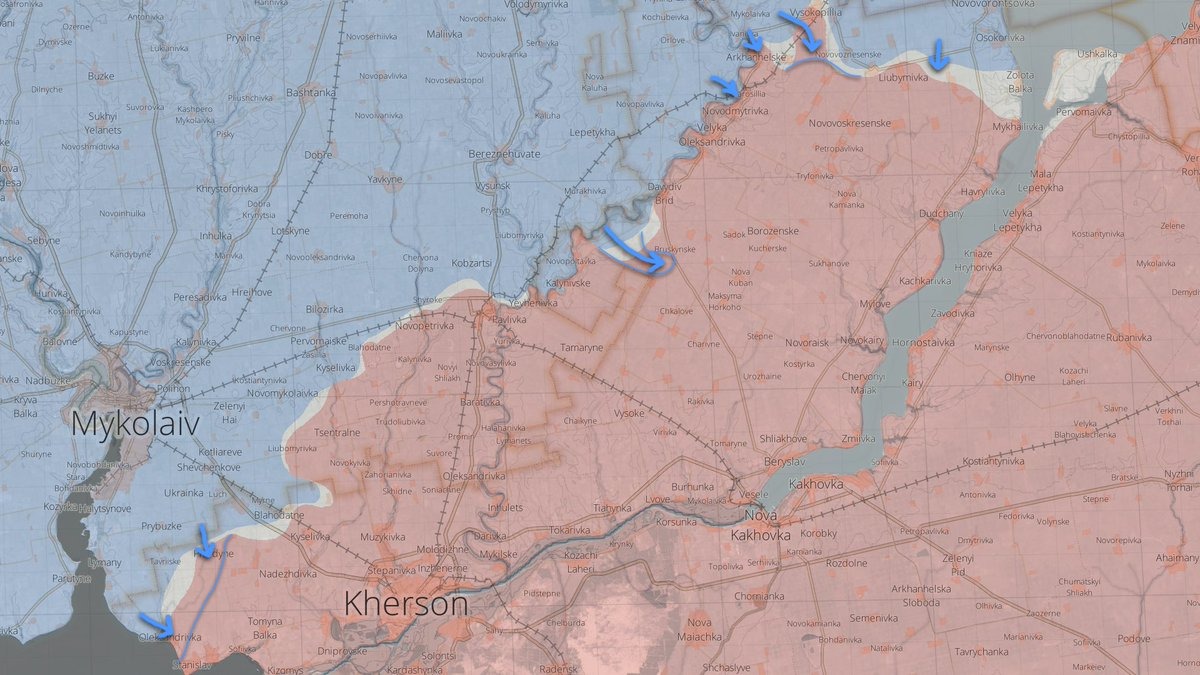According to a claim (which is confirmed by many researchers), Ukrainian forces expanded the Inhulets bridgehead near Davydiv Brid and approached the Bruskinske village from the south-west. The road next to it is one of the major supply routes for the Russian troops in Davydiv Brid. Cutting this road will significantly worsen the situation for the Russian troops and facilitate the advance of the Ukrainians.