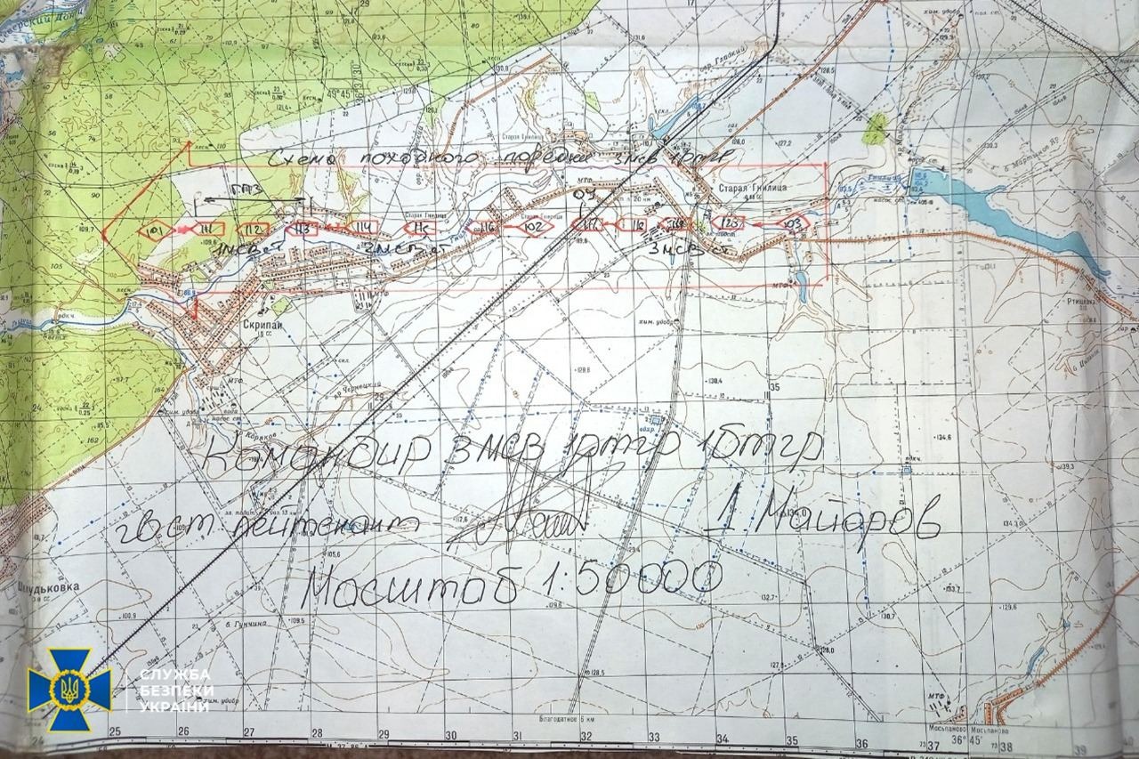 The Security Service of Ukraine (SBU) found and published maps from 1969 found among the papers of a soldier of Russia's 138th Motorized Rifle Brigade. Even though the maps feature tactical drawings of a Russian column on the march, we believe that Russian soldiers don't actually use those maps and keep them because regulations demand it.