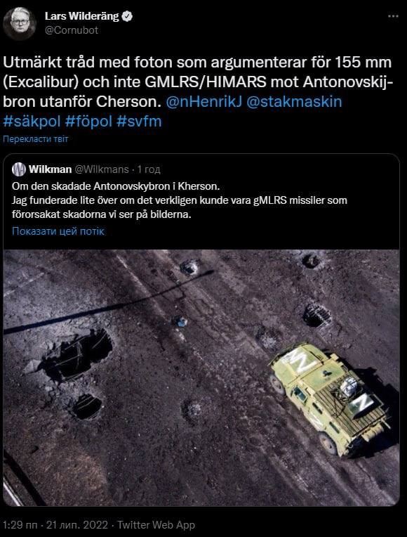 Swedish journalist Lars Vilderang has researched the photographs of the aftermath of the Antonivsky bridge attack and believes it was hit with Excalibur precision artillery shells, not GMLRS.