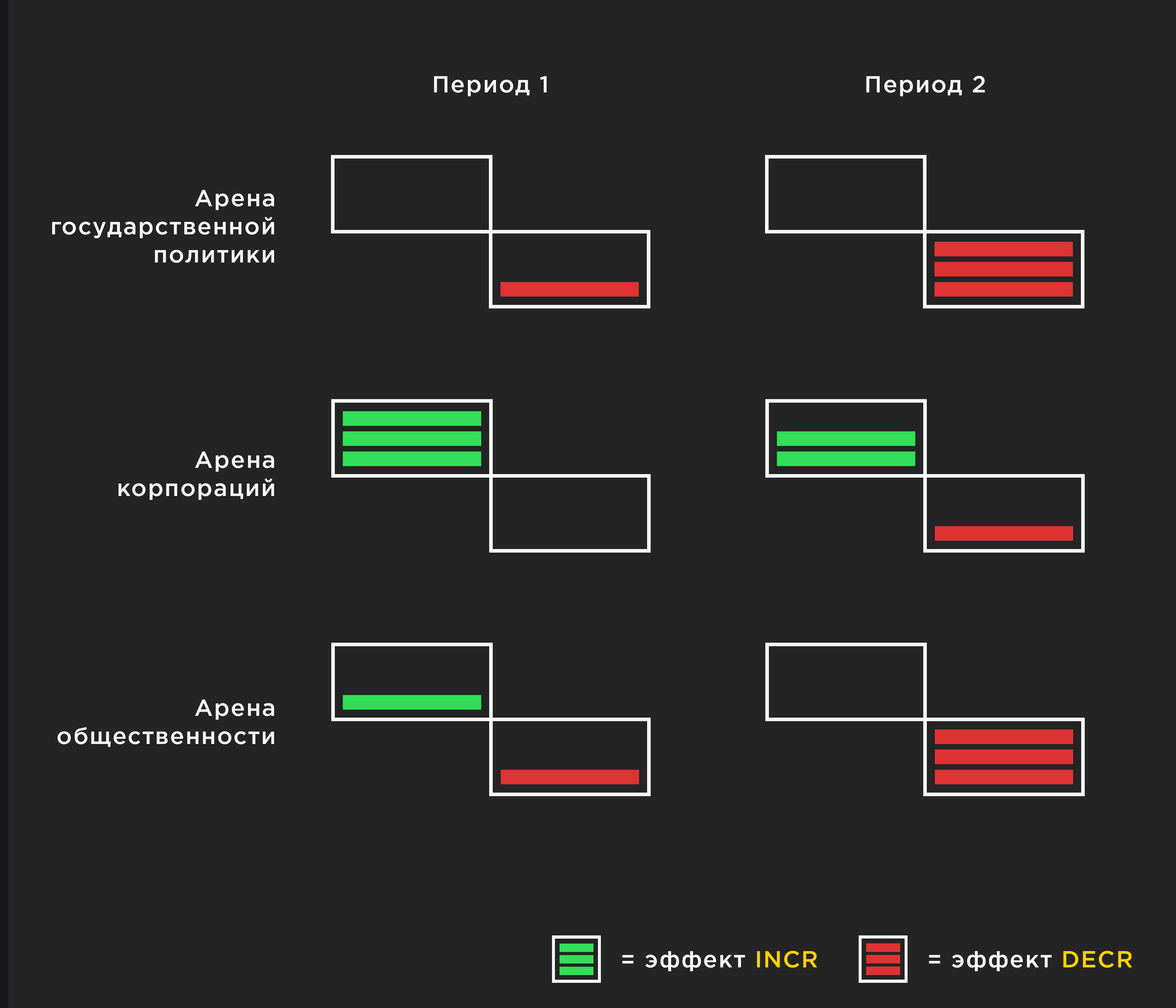 Ко второй половине кампании (период 2), ситуация значительно изменилась. Общий эффект высокой разрушительной способности теперь ослаблял кампанию. Вот главные факторы изменений на различных социальных аренах: