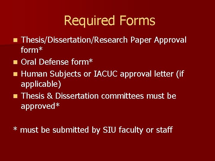 1 Guidelines for the Preparation of Dissertations , Theses and Research Papers SUBMISSION DEADLINES Spring β’ Initial Submission Deadline - 12th week of the Semester, Friday, 4:30 PM β’ Final Submission Deadline - 13th week of the Semester, Friday, 4:30 PM For example, for Spring 2021 the deadlines are