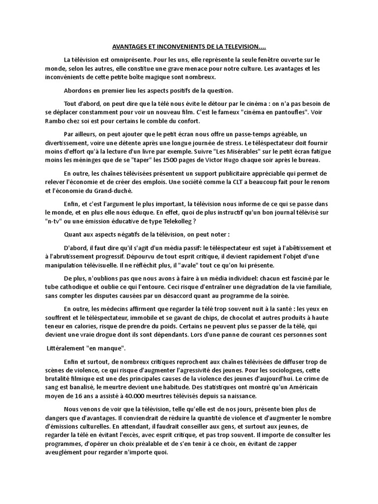 Les avantages de la télévision sont : -l'accès l'information par des documentaires, des émissions informatives, des techniques d'apprentissage distance, la publicité . - la télévision est aussi un passe-temps agréable . Les inconvénients de la télévision sont : elle donne aux jeunes la tendance imiter la violence et l'agressivité ; elle impose des modèles parfaits, ce qui . . .