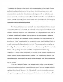 Emancipation de la femme . l'accès des femmes à l'éducation est un facteur clé du développement, à la fois sur le plan économique et social . C'est pourquoi, les ONG et la communautLa communauté internationale s'applique à mieux prendre en compte la question de l'égalité homme- femme dans les projets de développement, .