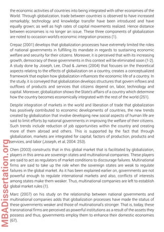 MBA Dissertation Sample on Globalization . Since the introduction of globalization process two centuries ago, multinational firms have managed to emerge as central institutions that regulate globalization processes and those that are facilitate trade practices in the global market .