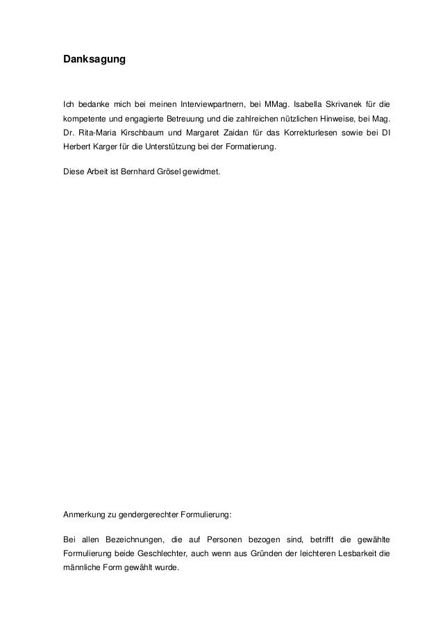 Denn nicht jedem liegt es, einen Text so zu verfassen, dass er sympathisch klingt, ohne ausufernd zu werden oder sich in nichtssagenden Phrasen zu verlieren . Schlieβlich kannst Du Dich auch persönlich bei allen bedanken, die Dich unterstützt haben . Daher ist es normalerweise auch kein Problem, die Masterarbeit ohne Danksagung abzugeben .