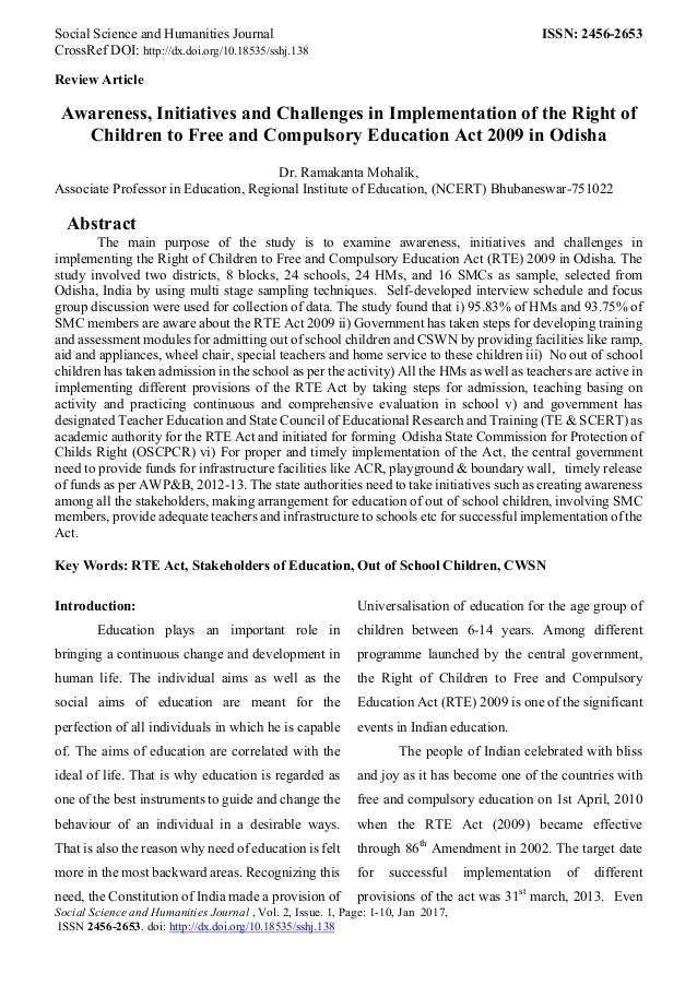 title: a study on right to education in india with reference to the right of children to free and compulsory education act 2009 an analysis: researcher: