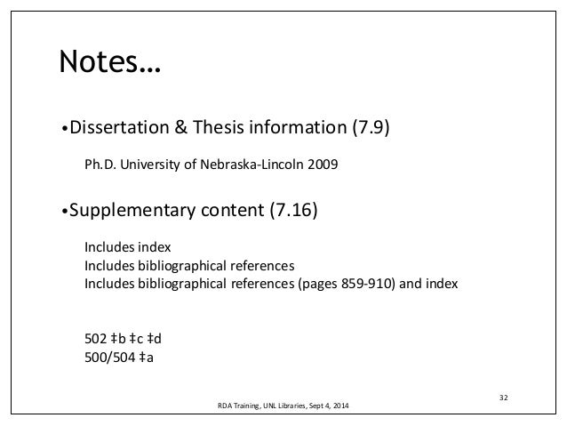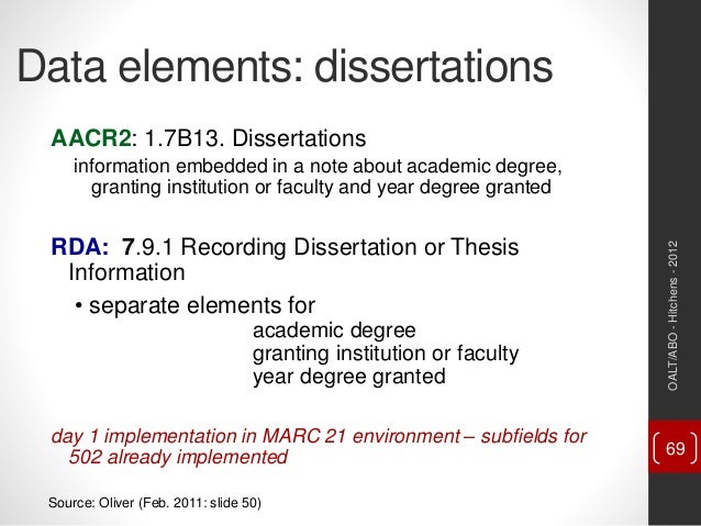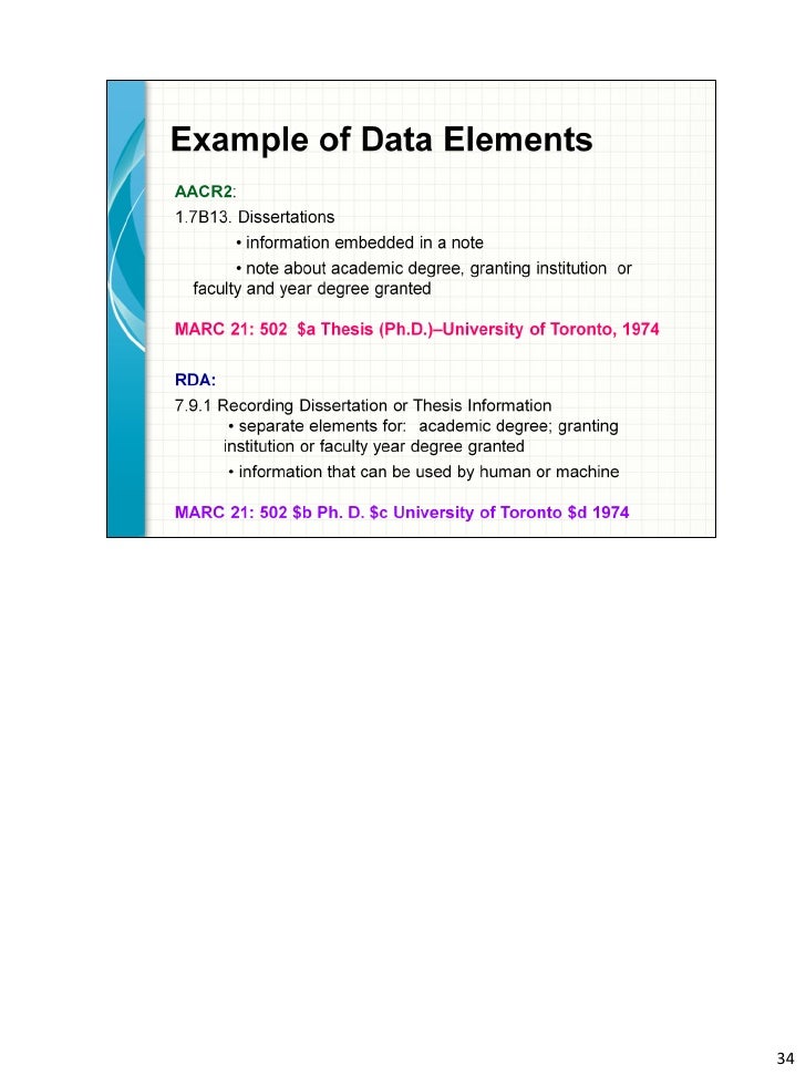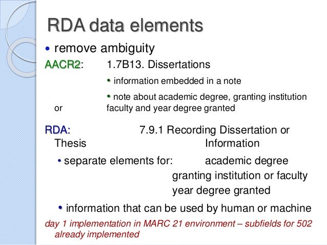 Re: [RDA-L] 502 dissertation note in RDA Zukowski, Adam Thu, 24 Oct 2013 06:58:43 -0700 RDA appears to consider each piece of data as separate elements ( RDA rules 7 .9 .2, 7 .9 .3, & 7 .9 .4) .
