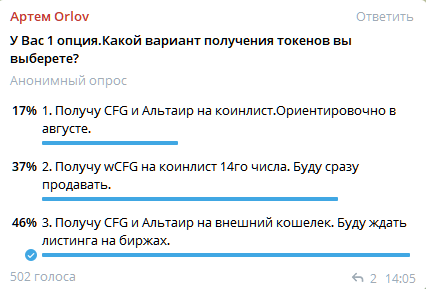 - Будет очень мало токенов, потому что, исходя из опроса с чата Centrifuge ru, всего 37% выберут 2 вариант + я видел объявления на отс, что у людей уже есть токены CFG и они готовы их продать.