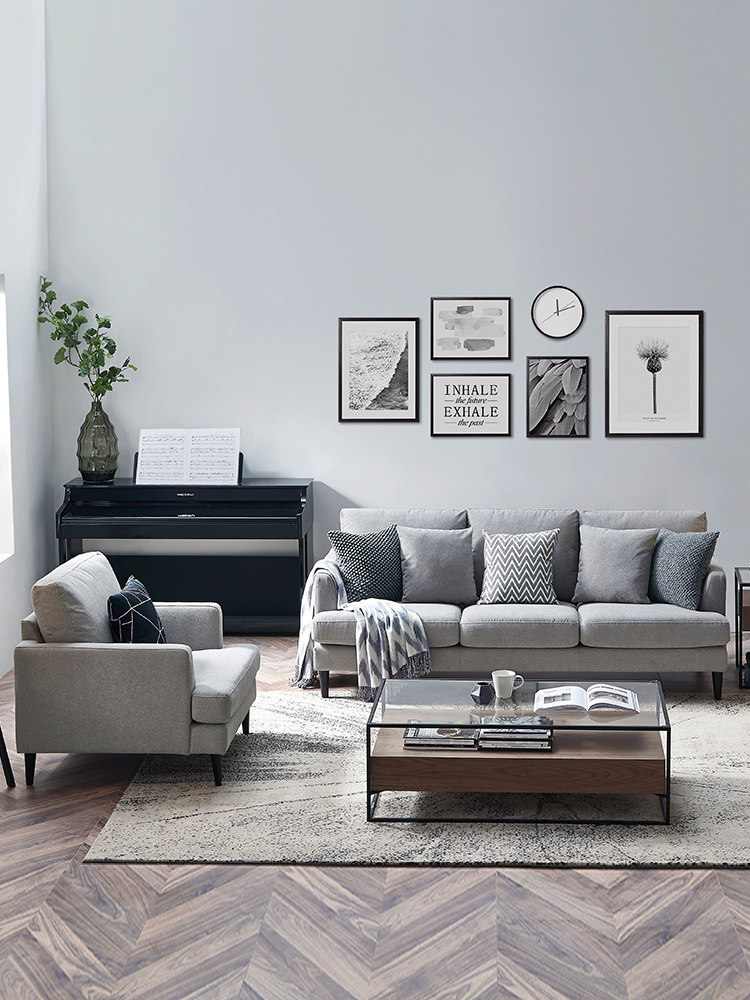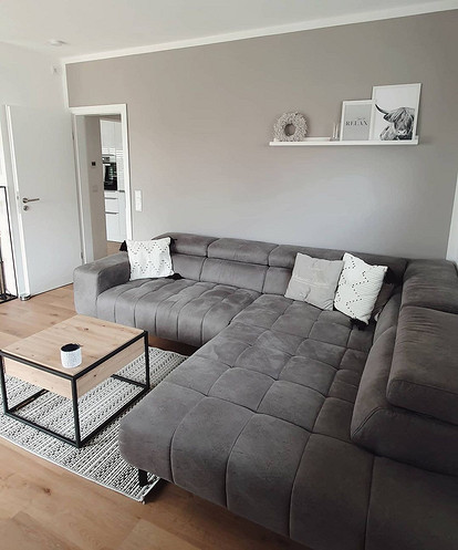 Современный стиль — черный диван с прямыми линиями, без дополнительных украшений . Прекрасная идея поставить его на сером фоне .