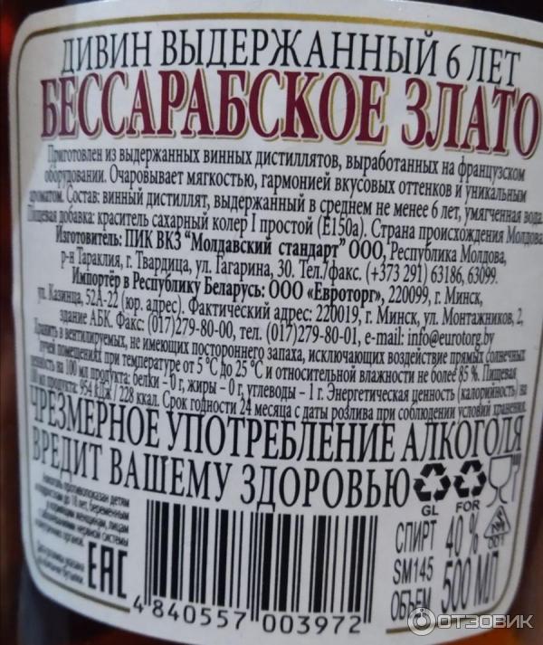 Состав: дистиллят для дивина выдержанный не менее 3 лет, вода питьевая умягченная, сахарный сироп, сахарный колер . Пищевая ценность в 100мл продукта: углеводы - 1 .5г . Гарантийный срок хранения: срок годности не ограничен при соблюдении условий хранения .