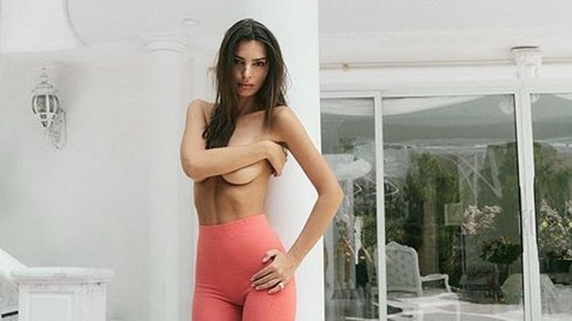 Длинноногая модель позирует топлесс