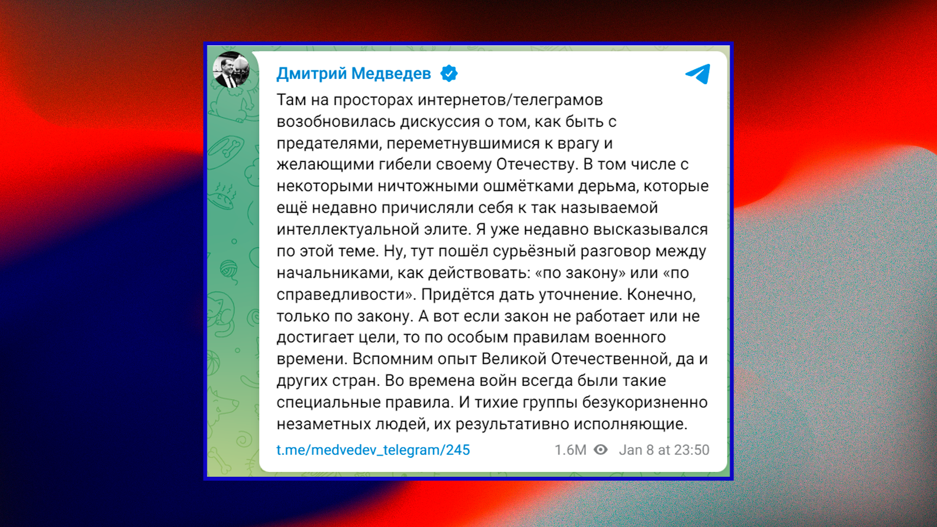 Новую партию, вне всякого сомнения, доставили. И этому есть прямые доказательства: Дмитрий Медведев разразился очередным постом в Telegram. На этот раз он пригрозил «предателям, переметнувшимся к врагу», что с ними будут поступать по законам военного времени, а исполнять это будут «тихие группы безукоризненно незаметных людей».