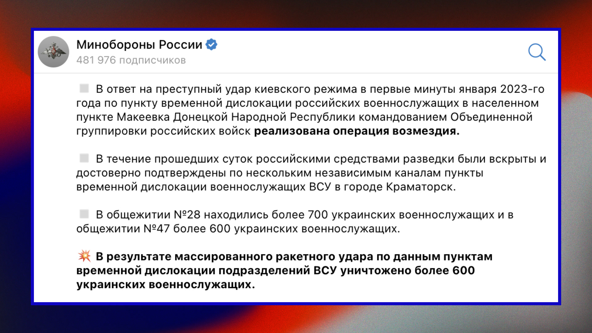 Все выходные Минобороны России и провластные блогеры разгоняли историю о так называемом «Ударе возмездия». Речь об атаке мест расположения украинских военных в Краматорске. По словам российских военных, в ходе удара погибли сразу 600 солдат.