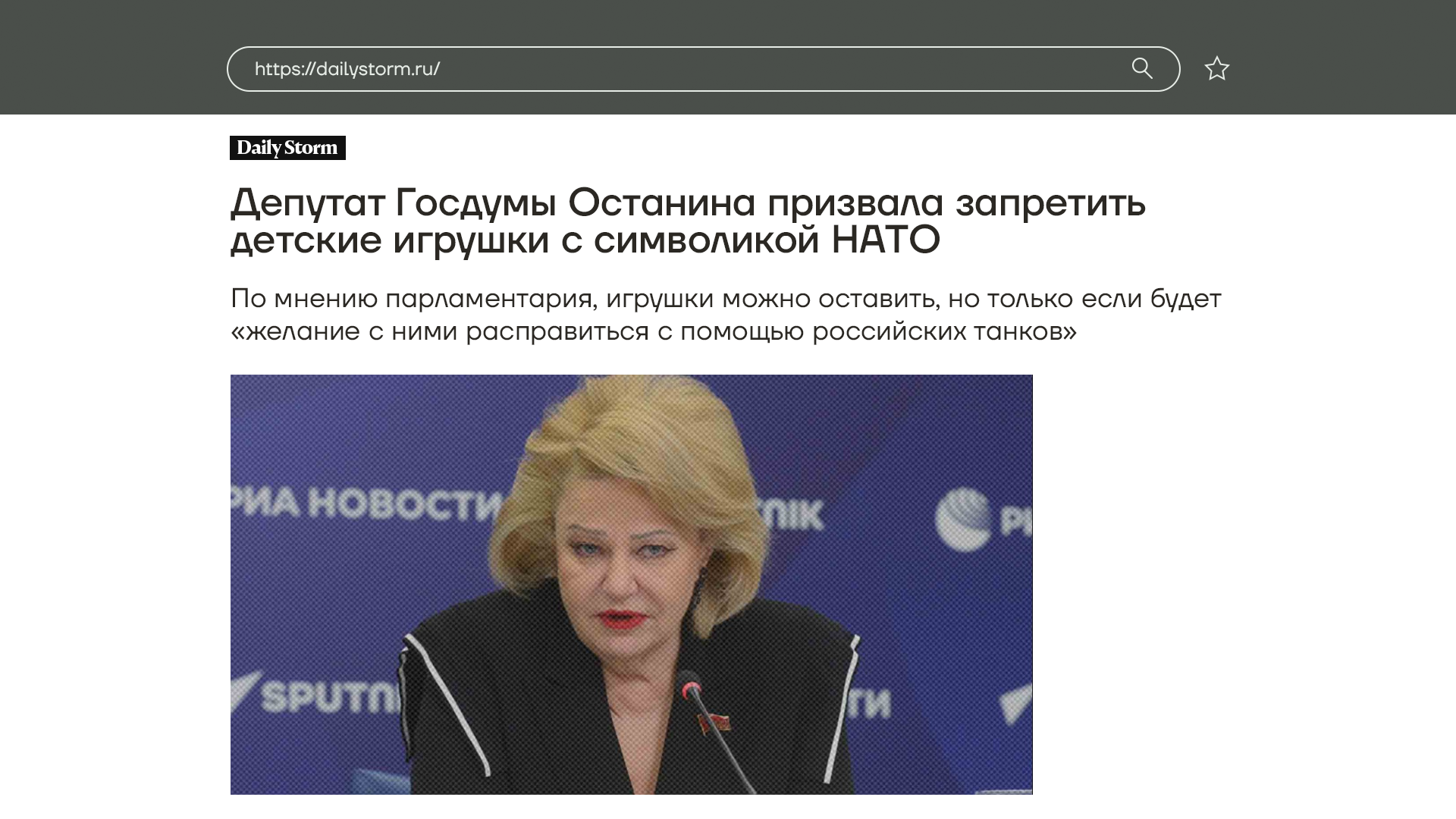 Депутат госдумы Нина Останина предложила убрать из продажи детские игрушки с символикой НАТО. Игрушечные танки Leopard и Abrams, по ее словам — элемент пропаганды вражеских стран. Депутат подчеркнула, что такие товары можно оставить в том случае, если у детей будет «желание с ними расправиться с помощью российских танков». И это говорит депутат по вопросам семьи, женщин и детей. Интересно, а 2 сына депутатши такие же ненавистники НАТО, наверное, находятся сейчас на фронте в российском танке?